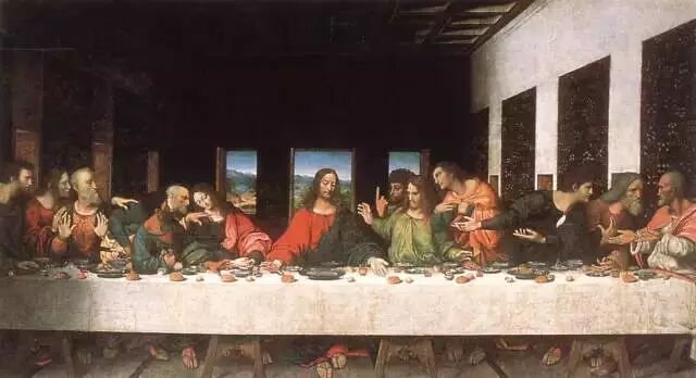 《最后的晚餐》取材于《新约圣经》:耶稣最后一次到耶路撒冷去过逾越节。犹太教祭司长计划在夜间逮捕他,苦于无人带路,门徒犹大向犹太教祭司长告密。逾越节当天,耶稣跟12个门徒共进最后的晚餐,他对12个门徒说:“我实在告诉你们,你们中有一个人要出卖我了!”画面中吓得往后退的人,就是叛徒犹大。