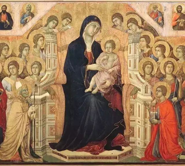 这幅祭坛画属于乔托早期的宗教画。宝座前的左右两侧各有一跪着的天使,圣母抱着圣婴坐在宝座上,椅侧是圣保罗、圣加百列、圣米迦勒等传统人物。构图完全对称,为了表达圣母的女性人体,在衣服上添上了一些明暗光影,是中世纪宗教壁画上较少见的成功尝试。
