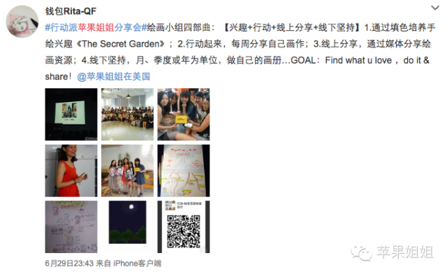 绘画小组四部曲:兴趣+行动+线上分享+线下坚持。1.通过填色培养手绘兴趣《The Secret Garden》;2.行动起来,每周分享自己画作;3.线上分享,通过媒体分享绘画资源;4.线下坚持,月、季度或年为单位,做自己的画册…GOAL:Find what u love ,do it & share!