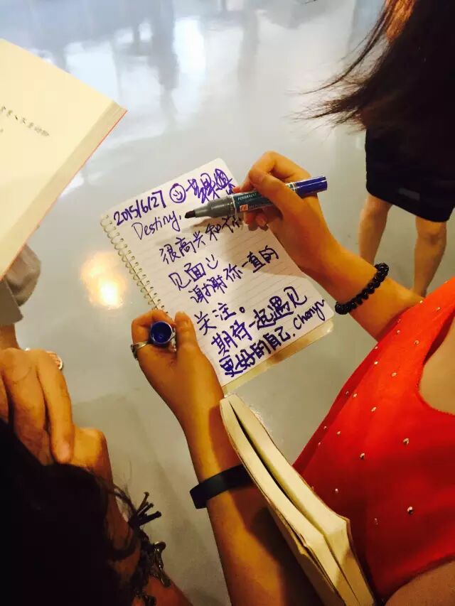 音乐组的Destiny 是一个在珠海读大一的小姑娘,她去年底加了我微信,开始我并不了解那个网络对面的她。慢慢地,Destiny坚持和我分享有意思的图片和文字,也尝试翻译我的英文博客,当我的粉丝群管理员。 虽然未曾谋面,我觉得已经很了解她。这次终于见到了这个很萌很善良的女孩。