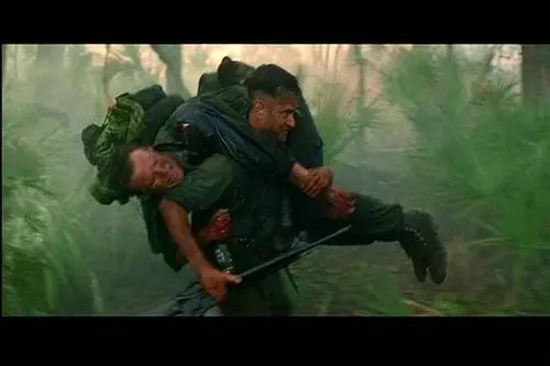 他是个善良的傻子,所以当他发现自己连队的兄弟都没他跑得快,没跟上来时,他又往回跑,去寻找自己的战友。他一次一次从丛林中找到受伤倒地的战友,一个个将他们背了出来。他发现自己的长官身受重伤,下肢被炸断了,长官要求他将自己一枪崩了,来个速死,他不听,将长官也背了回来。