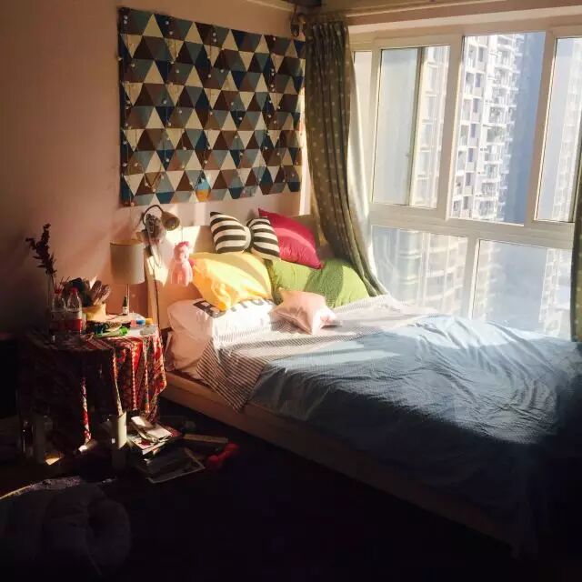 如果说墙面+地面占据房间视线的半壁江山,那么另一半的江山莫属床品+窗帘。通常出租屋看上去如此不堪,也多与红红火火恍恍惚惚的窗帘有关。