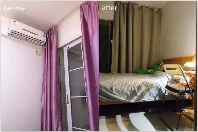 在上面这张前后对比图中,答主换下骚粉紫blingbling窗帘,从上到下换成色调统一的窗帘、床铺、地毯,房间顿时改头换面。