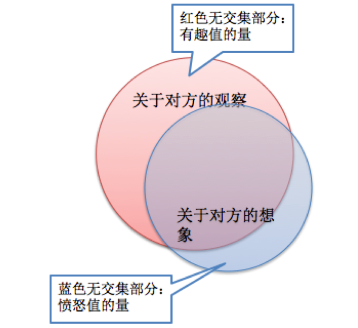 需要理解的是,这个图是动态的,随着他对你的预期和你的表现不断变化。日常中大多数人会这样从恋爱初期的上图1,转到老夫老妻时期的图2。如果需要一个人一直爱你,那你需要保证纯红色的那个月牙儿部分,要比纯蓝色的月牙儿部分要多。