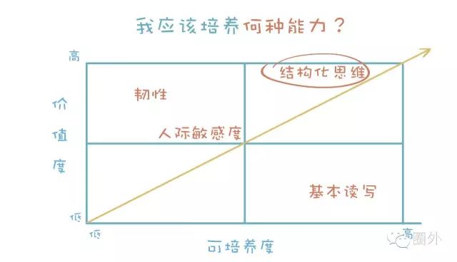 我曾经在文章中提到过能力的重要性。有人问,能力有那么多,到底培养哪一个才好呢?如果我用一个两维矩阵来分析的话,可以看到,结构化思维能力,是既能够被培养同时价值度又高的能力。