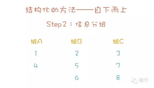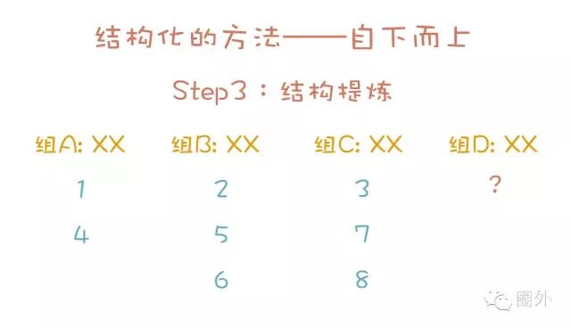 2)自下而上归纳总结成结构:当你不清楚可以用什么框架的时候,四种方式把信息结构化
