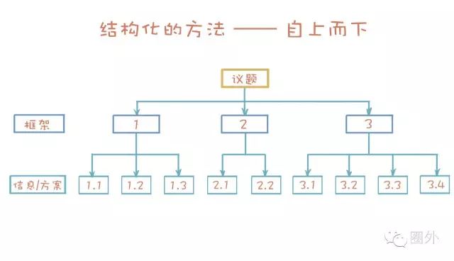 但是,当你面临一个难题的时候,该如何去寻找结构呢?这里给出两种方法:一种是自上而下地找结构,一种是自下而上地归纳提炼结构。