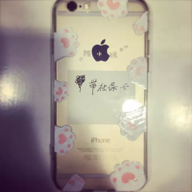 还有一天,也是路过,看她在倒腾手机壳,便多驻足了一会。只见她把写好的便利贴放在半透明的手机壳里。