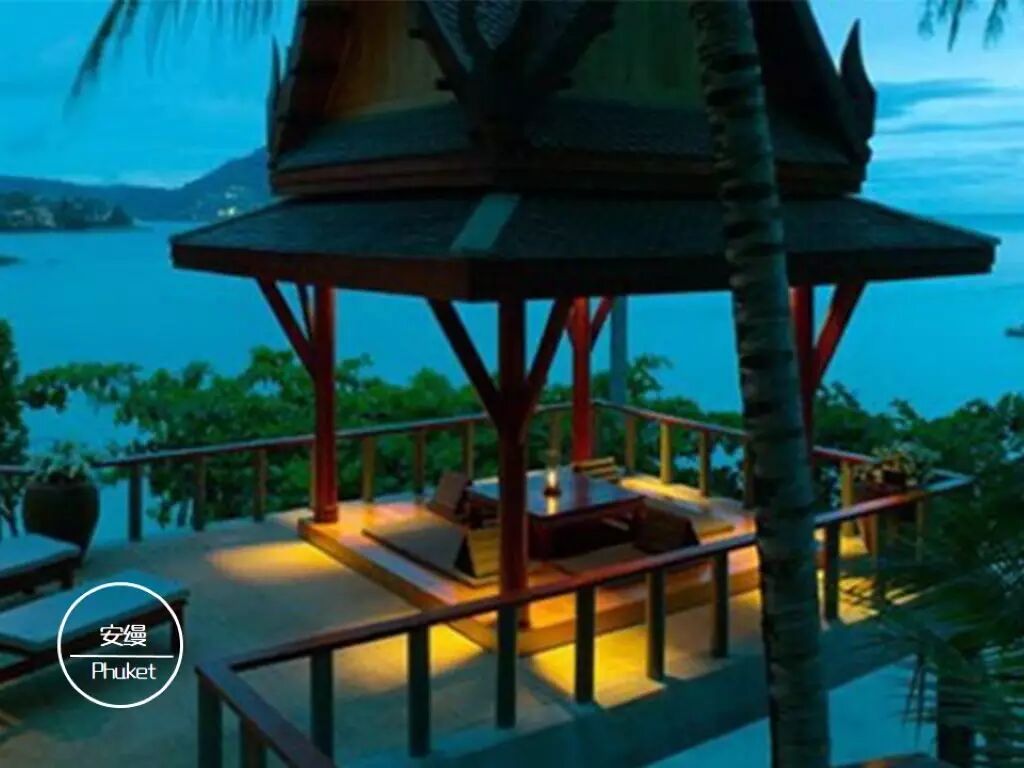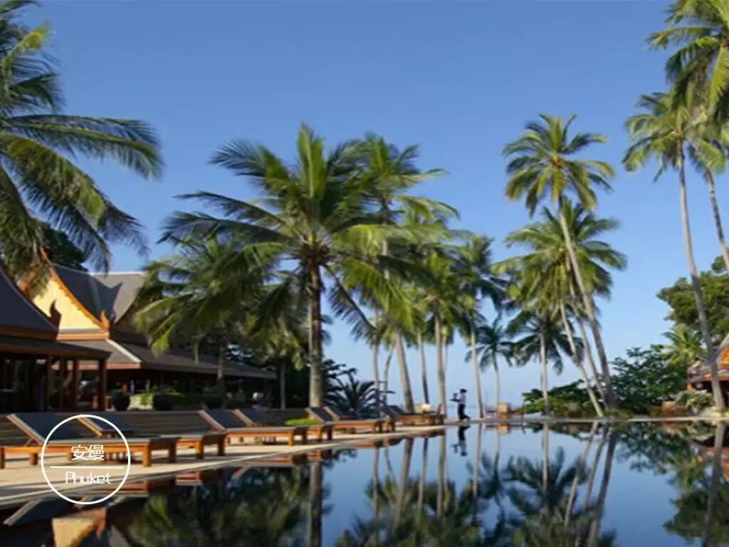 看一下,这是第一家安缦,位于普吉岛,大家可以看到这都是酒店的实景。我们看到这是安缦非常著名的发呆亭。这家安缦的建筑呼应泰国古老王朝的风格,拥有着东南亚最大的以酒店为基地的船队,这个酒店从安达曼海包船作为专属的行程,也就是客人可以坐着船,在船上喝着下午茶,游览整个海洋。